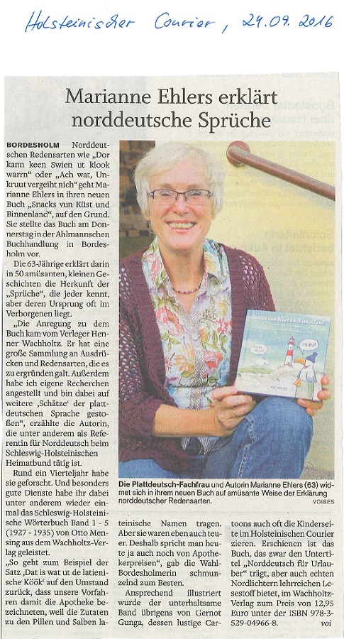 Wegen ihres großen Engagements für die niederdeutsche Sprache und Kultur hat Marianne Ehlers aus Bordesholm am Dienstag eine der höchsten Auszeichnungen Deutschlands, das Bundesverdienstkreuz am Bande, bekommen.